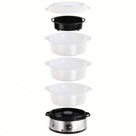 Cet appareil est équipé de la fonction vapeur rapide qui permet de produire une vapeur instantanée pour une diffusion optimale de la vapeur à tous les étages. La vapeur est diffusée grâce aux grilles perforées. Les 3 récipients sont bien évidemment amovibles et vous permettent de cuire tous vos aliments ainsi que des pièces volumineuses (poissons, volailles, artichaut...). Pratique, vous pouvez également cuire du riz vapeur ou des oeufs grâce au bol à riz et support à oeufs inclu.